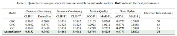 定量的評価では、キャラクターの一貫性、コンテキストの一貫性、アクションの品質、状態更新(シーンが切り替わる時の品質)、そして推論時間に関する各種指標を自動計算して比較しました。その結果、AnimeGamerがすべての評価観点で最高評価となりました。