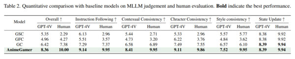 研究チームは、AnimeGamerを評価するために評価指標を自動計算する定量的評価と、GPT-4oと人間評価者に評価してもらう定性的評価を実施しました。なお、AnimeGamerと同等の機能を有する既存モデルは存在しないため、既存のテキスト生成モデルと動画生成モデルを組み合わせて比較モデルを構築しました。