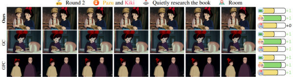 以下の画像は、実際にAnimeGamerと比較モデルが出力したアニメーションの一部です(画像の右側にゲームパラメータを表示)。登場人物は『天空の城ラピュタ』のパズーと『魔女の宅急便』のキキ、入力テキストは「静かに本を調査する」、背景は「部屋」です。上段の「Ours」が、AnimeGamerが生成したフレーム群です。下段および中段の比較モデルの生成結果では、入力情報が正しく反映されていません。注目すべきは、パズーとキキが同時に登場するシーンは学習データでは存在しないにもかかわらず、AnimeGamerは正しく生成できているところです。