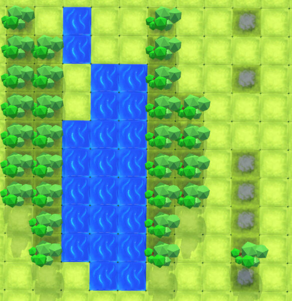以下の1枚目の画像が、GIPのゲームフィールドの鳥観図であり、2枚目が「森の中の川」と入力して生成されたサブグリッドの地形です。