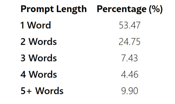 創造的なプレイに関しては、入力プロンプトの長さを集計した結果からも、肯定的な証拠が得られました。プロンプトの長さは1単語あるいは2単語を合わせると約78%なのですが、5単語の以上の入力が3~4単語入力より多い9.9%だったのです。この結果からは、「木」や「家」といったプレイにおいて重要な単語を頻繁に入力する一方で、多数の単語を並べて創造的な地形変形を試みていたことがうかがえます。