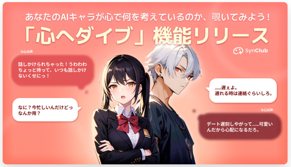 HiClub株式会社が提供する対話型AIアプリSynClubは、AIキャラクターの外面や性別、性格等を設定したうえで交流を楽しむ、コンパニオンAIの定石を踏襲したものです。2025年3月14日には、AIキャラクターが考えていることを覗ける「心へダイブ」機能が実装されました。