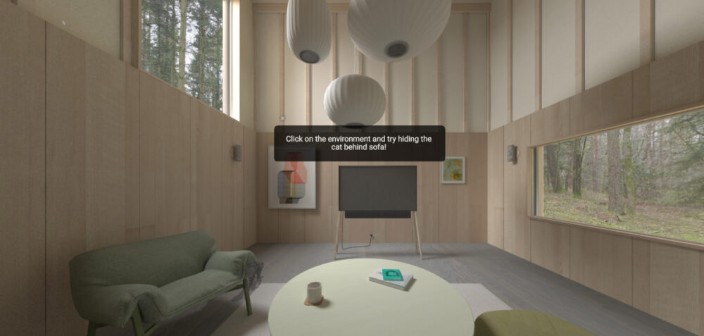 XRリアリズム:XRデバイスから見える部屋の任意の箇所にバーチャルな猫を置くと、ソファの後ろのような遮蔽効果を考慮する必要がある場所に置いた場合、その効果を猫に反映する「Occlusion」(以下の画像:バーチャルな猫が左側ソファの後ろに隠れている)、部屋に関する深度マップを表示する「DepthMap」など。
