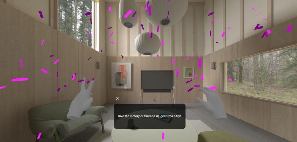XRインタラクション:バーチャルなハンドによって絵文字を表示する「XR Emoji」、バーチャルなハンドによってじゃんけんを行う「Rock Paper Scissors」など。以下の画像は、勝利サイン(「ピースサイン」)を表示したもの。