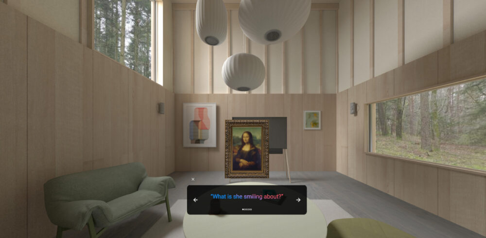 AI + XR統合:選択したオブジェクトに関する詩をGeminiに生成してもらう「XR Poet」、Geminiとの会話を楽しむ「Gemini Icebreakers」(以下の画像は、Geminiと絵画「モナ・リザ」について会話しているところ)など。これらのサンプルを実行するには、Google AI studioからAPIキーを取得する必要がある。