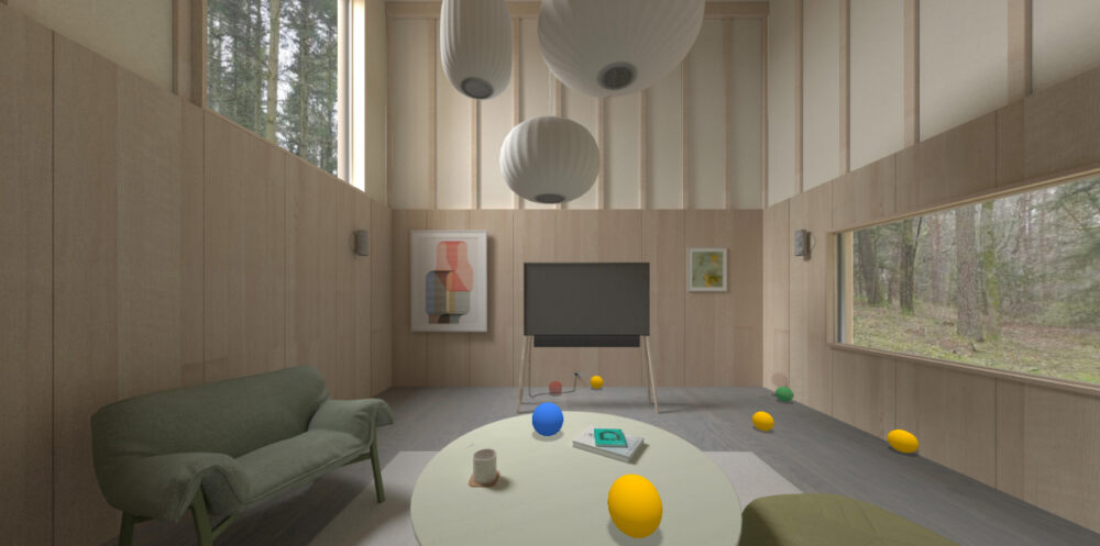 さらに高度なサンプルとして、部屋内にバーチャルなボールを投げる「Ballpit」(以下の画像)、バーチャルなカラーボールを投げると、それが割れて部屋にバーチャルな染みができる「Splash」などもあります。