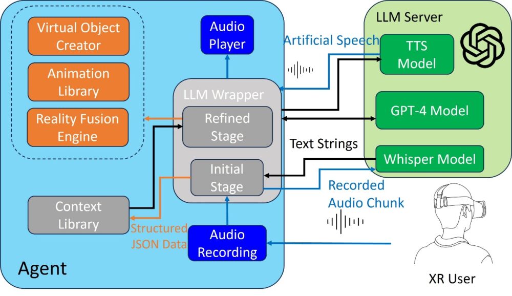 - XRヘッドセットに向かって発したタスク指示に関する音声入力(画像右下)は、Audio Recordingモジュールにデジタル情報として渡された後、LLM Wrapper(画像中央)に送られる。