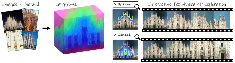 しかし SIGGRAPH Asia 2025で発表された各種論文の内容を解釈すると、その一方的な関係性が明確に変化してきています。例えば象徴的なのが論文「Lang3D-XL: Language Embedded 3D Gaussians for Large-scale Scenes」です。この研究では、文言としての情報が正確な3D表現に用いられる「3D Gaussian Splatting」の構造そのものに埋め込まれた活用事例です。