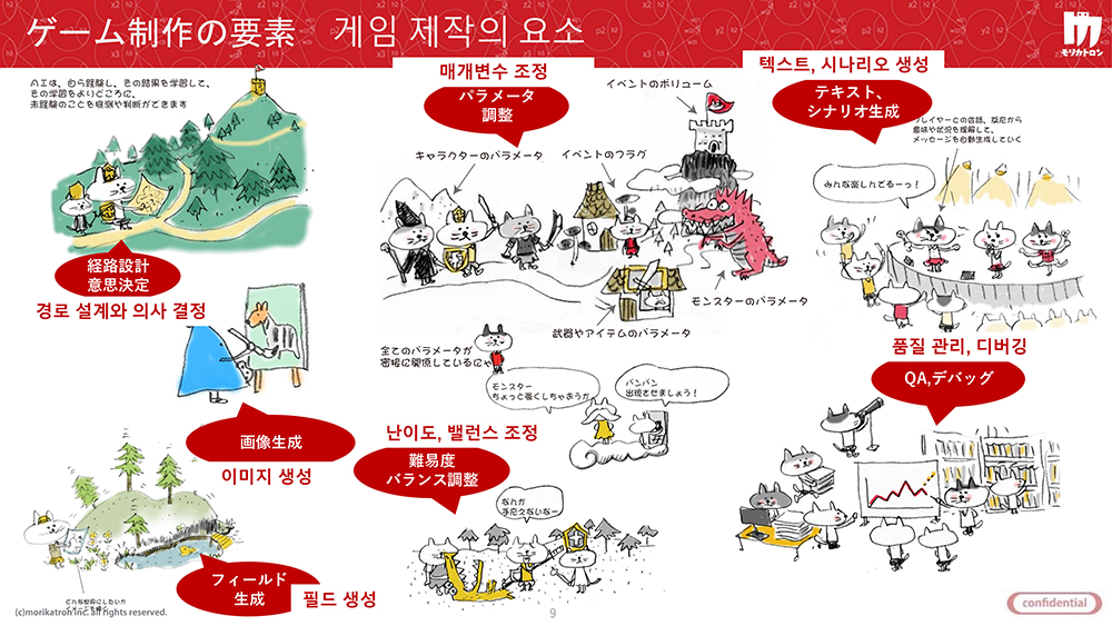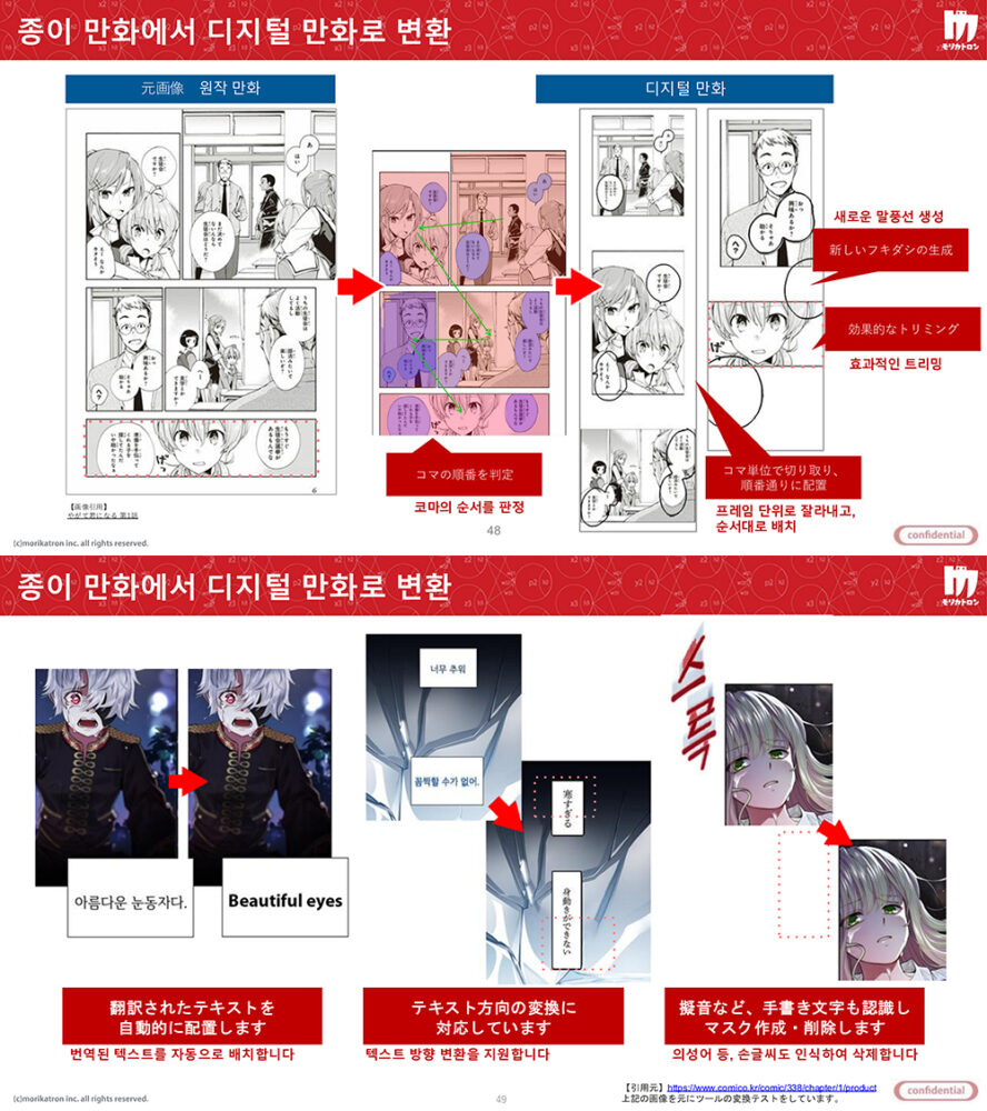 まず、日本語をハングルに翻訳します。そこからコマの順番を判定し、縦読みに配置します。画がないところは補完しなければなりませんし、擬音等の手書きの文字は別途、文字と判別して翻訳し、元の文字を消す必要があります。地味な作業ですが、高度な技術を必要とするAIです。