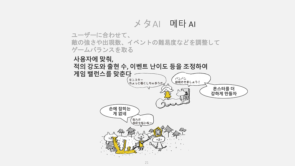 メタAIは、ゲーム内で起きること全体を制御するAIです。ゲーム中にプレイヤーのスキルや状況に合わせて、ゲームバランスをリアルタイムにコントロールします。最初に設定したゲームバランスがプレイヤーによっては簡単すぎたり、難しすぎたりした場合、それらを調整しながらプレイヤーを楽しませてくれるAIです。