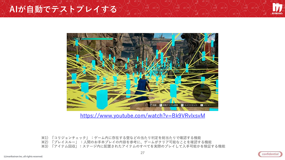 AIによる模倣学習は、テストプレイやQAテストの領域で使わます。一度人間がお手本を見せると2回目以降は自分でフィールドを周回プレイします。ゲームを製品化するには何度も何度もテストをする必要があります。設定したゴールに本当に辿り着けるか、プレイヤーが配置したアイテムはすべて取得可能か、設定どおりに敵が出現するかなど、単純なテストプレイを延々とする必要があります。その部分をAIに任せることができれば、他の部分にリソースを割くことができます。開発支援用のAIと言えます。