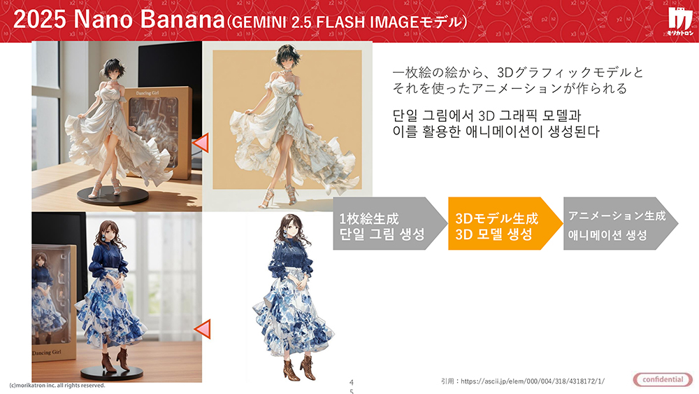 次に、マンガから動画まで作ってしまうAIです。ここではモリカトロンが作ったツールが紹介されました。マンガの1コマ1コマを切り出し、音声もAIで制御して割り当てています。4種類くらいからキャラクターに合わせて音声を当てて、いま話しているキャラクターを判別して、その声で話します。同時に翻訳も可能です。一枚の絵から動画を作るまでに20分程度です。