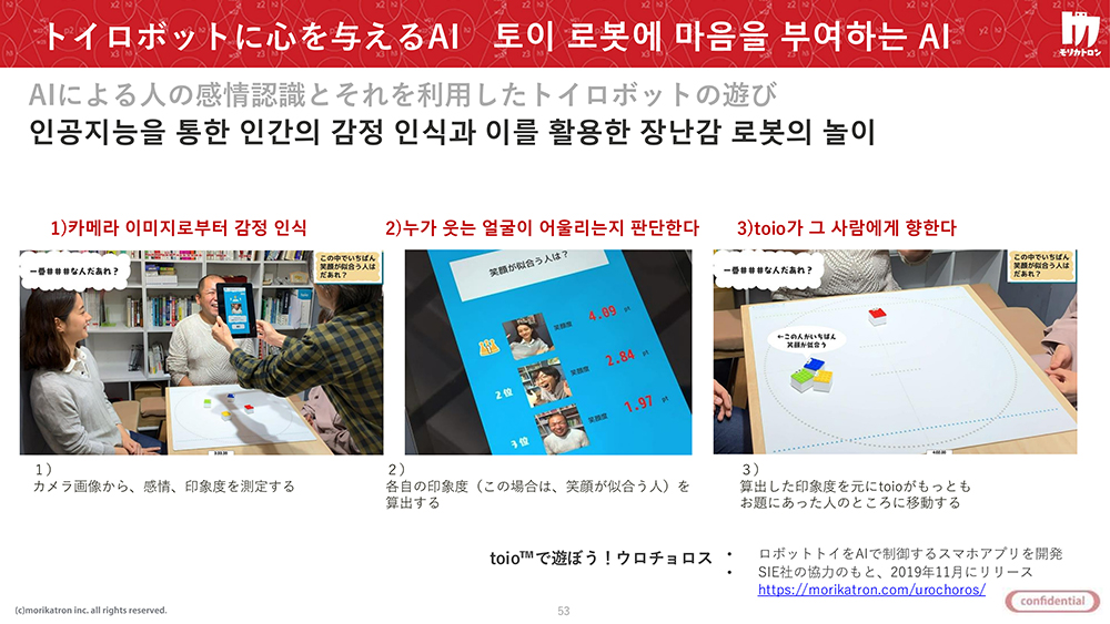 モリカトロンでは、AIとトイロボットを使った『ウロチョロス』というコンテンツを作りました。トイロボットに搭載したAIが人間の表情を読み取り、その後、指示に応じた行動を取ります。例えば、カメラを通して人間の感情や印象を測定し、「笑顔が似合う人は誰か」という質問に、それぞれのロボットが「一番笑顔が似合う」と思う人に向かいます。ロボットごとに好みがあるので、すべてのロボットが同じ人を選ぶわけではありません。