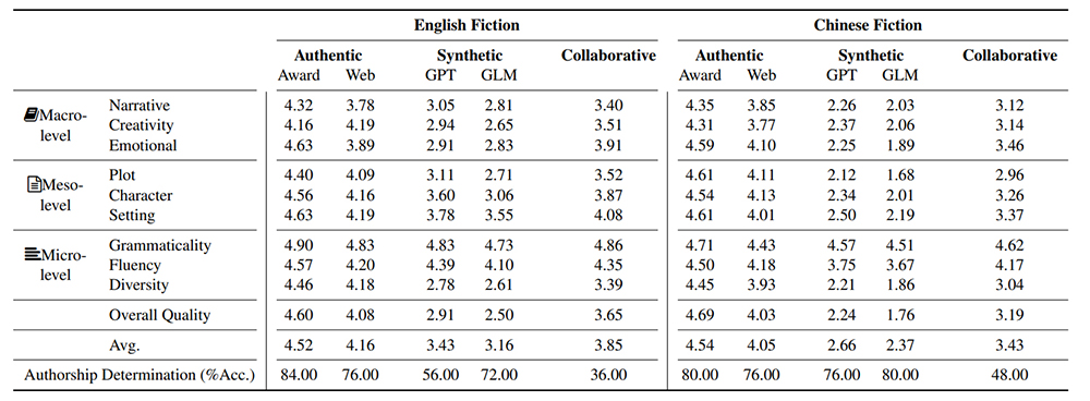 以上の小説評価の結果は、以下の表のようにまとめられます。なお、表中の「Authentic」は作者が人間の小説を意味し、さらに「Award」は文学賞受賞作、「Web」はウェブ小説であり、「Synthetic」はLLM生成小説、「Collaborative」は人間とLLMの協働を意味します。