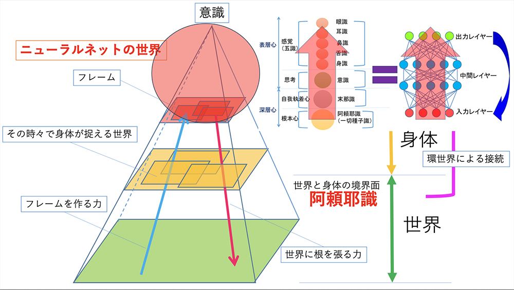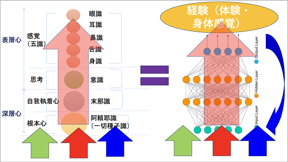 下から世界(刺激・情報)が入ってくる阿頼耶識(あらやしき)、自分と他を分ける末那識(まなしき)、そして思考や五感に対応する識があります。これは、まさにニューラルネットの基礎構造であるパーセプトロン(下から情報が入ってきて中間レイヤーがあり、出力へ流れていく)と同じ構造です。