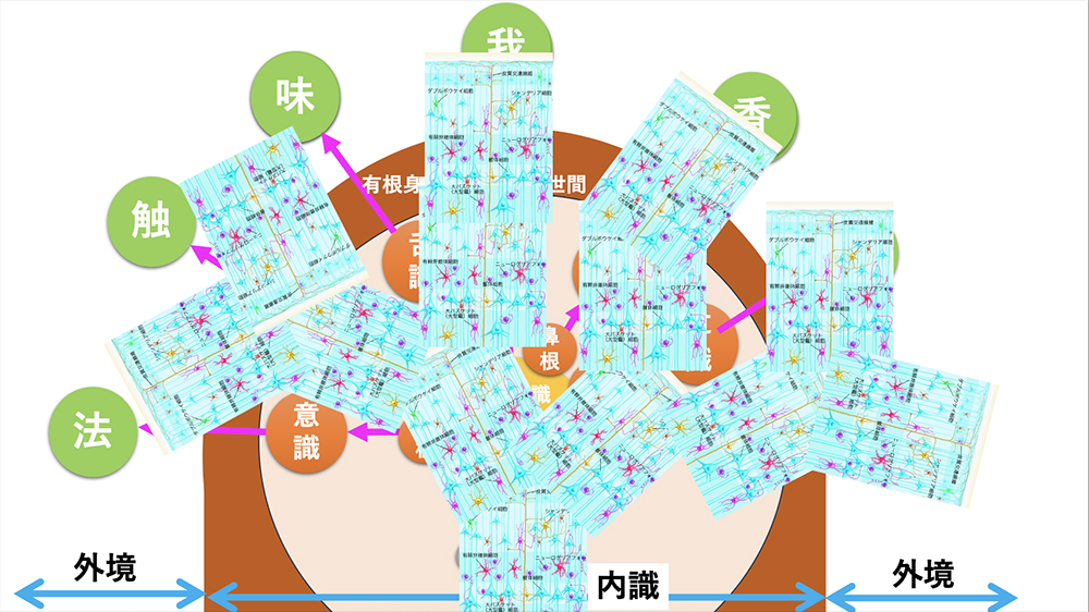 ※唯識:すべての存在は、視覚、聴覚、嗅覚、味覚、触覚の五感、意識、2層の無意識から成る8つの識(八識)から成り立つとする大乗仏教の思想
