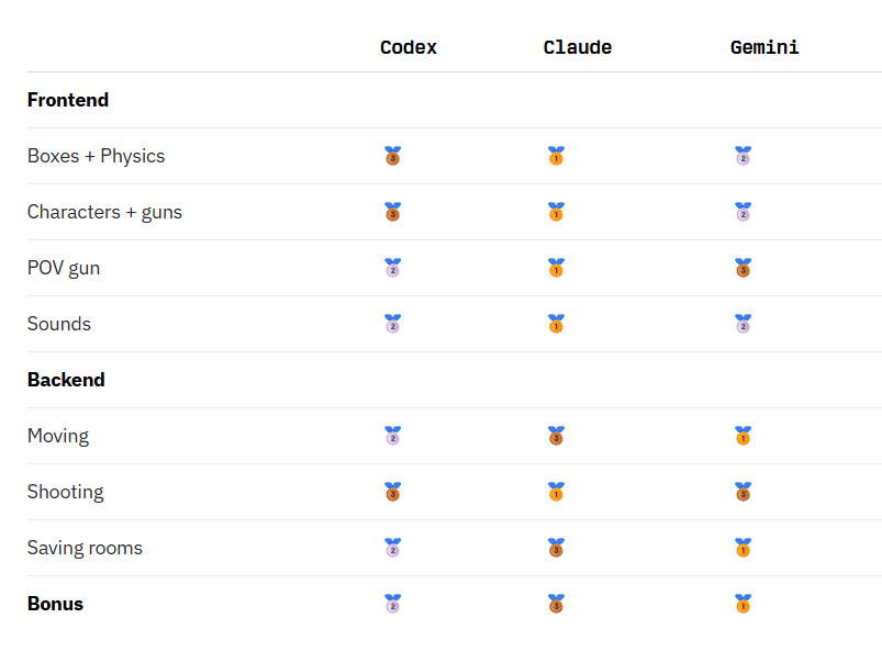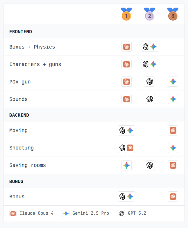 フロントエンドに関しては、依然としてClaude Opus 4.5がもっとも優れているものも、バックエンドに関してはGPT-5.2はGemini 3 Proに匹敵しました。