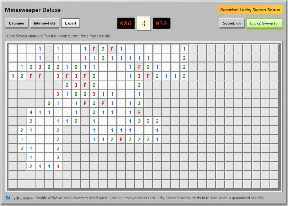 もっとも評価されたのは、OpenAI Codexの9点でした。ゲームは問題なくプレイでき、グラフィック面にも欠点がありませんでした。追加機能の「ラッキースイープボーナス」(以下の画像の右上のボタン)を使うと、安全タイルを1つ得られるというものでした。この機能は地雷である確率が同じタイルが並んでいる場合に有効であり、なおかつゲームバランスを崩壊させていません。