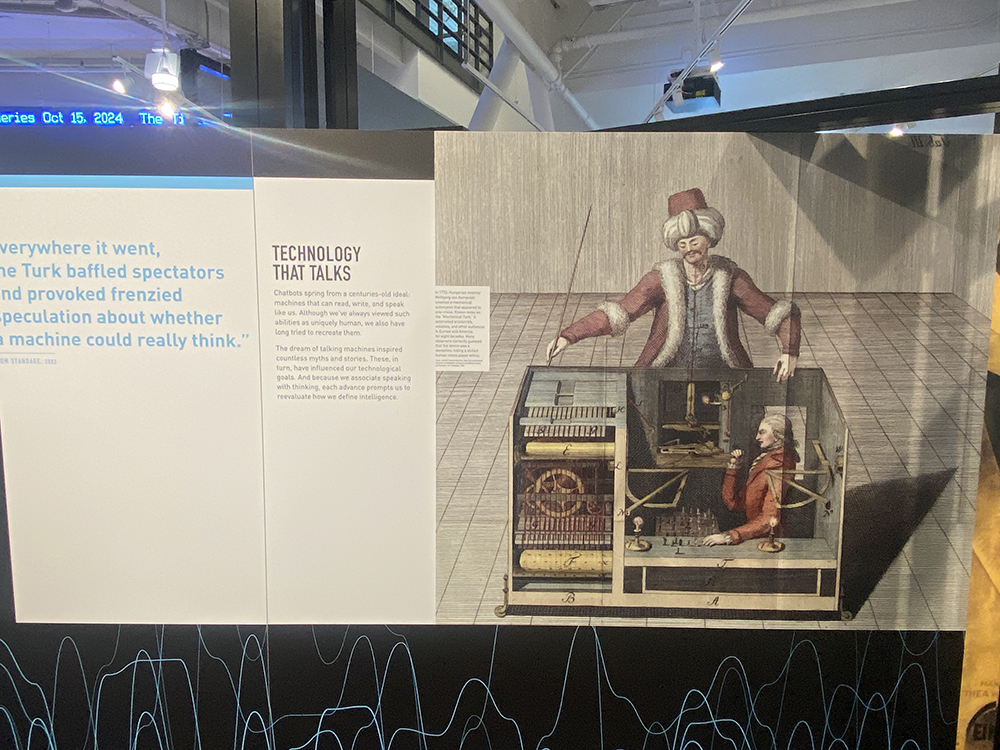 展示では「チャットボットはどこから来たのか?」という問いから始まり、いきなり現代の生成AIから展示を始めていません。むしろ何世紀も前の物語と人間の錯覚から始めています。象徴的なのが、1770年に公開された「メカニカル・ターク(Mechanical Turk)」。チェスを指す自動人形のように見せかけながら、実は箱の中に人間が隠れて操作していたという、要するに、すごい技術ではなく、すごい演出が人々を圧倒させた事例です。