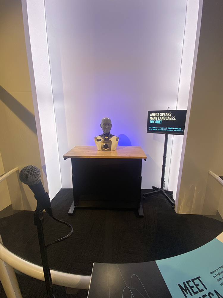 Chatbots Decoded: Exploring AI、展示のハイライトのひとつが、対話型ロボットとのインタラクションです。この展示ではEngineered Arts社のロボット「Ameca」が登場し、センサーや顔認識、そしてOpenAIのGPT-4大規模言語モデルを用いて来館者と表情豊かに対話します。日本語による対話もスムーズでした。会話だけだったチャットボットが身体を得た状態です。