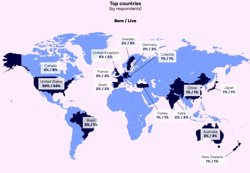 アメリカ出身の回答者は50%で居住者が54%となり、同国関係者が最大グループとなっています。居住者が出身者より多いのは、アメリカ国外から同国に移住した回答者がいることを示唆しています。日本人の回答者は、1%でした。