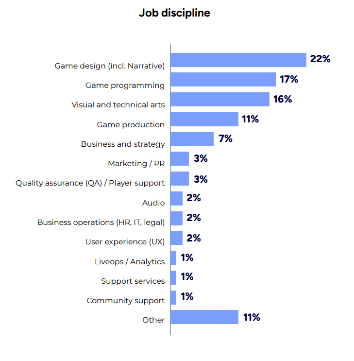 回答者の職種は、以下のグラフの通り。ゲームデザインとゲームプログラミングが上位となる一方で、マーケティングや音響、サポートサービスもふくまれています。