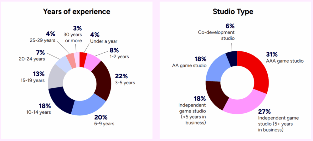 以下のグラフは、回答者の業界経験年数とスタジオタイプを表しています。経験年数10未満が半数以上を占め、AAAスタジオとインディーズスタジオで約3/4(76%)となっています。