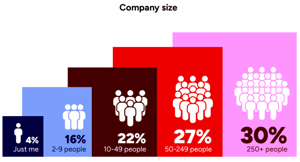 最後に回答者が属するゲームスタジオの人員規模は、以下の通り。250人以上の大規模スタジオが30%ともっとも多い一方で、2~9人が16%、1人だけが4%いました。