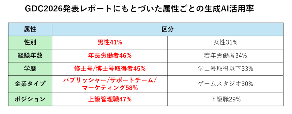 生成AIを活用する回答者を属性別に見ると、以下のようになります。女性より男性が多く、若年労働者よりキャリアの長い年長労働者が多く、コーディングなどを担当するゲームスタジオよりパブリッシャーやマーケティング企業が多く、下級職より上級管理職が多い結果となりました。