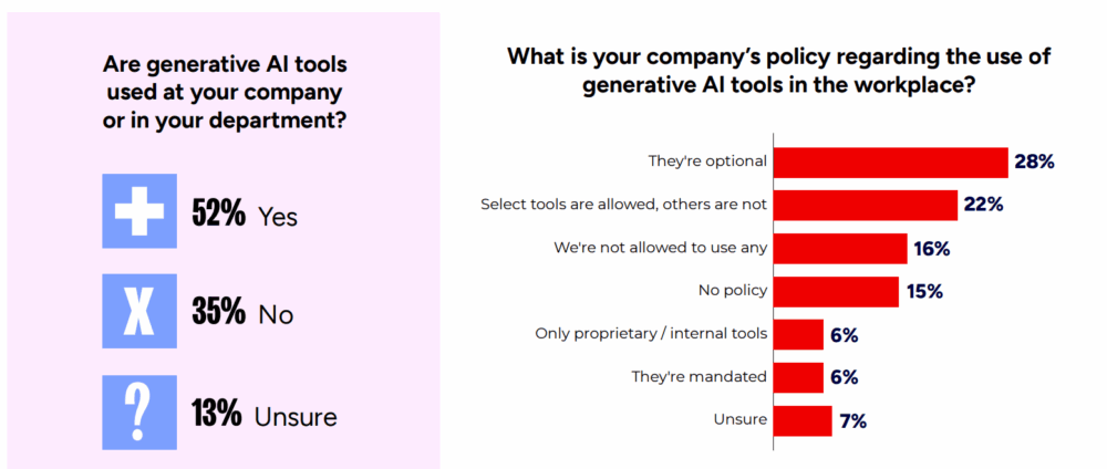 「職場における生成AIツール使用に関する会社のポリシーは、どんなものですか」という質問については、任意使用が28%ともっとも多く、何らかのかたちで使用を許可している割合は3/4以上(77%)となっています。