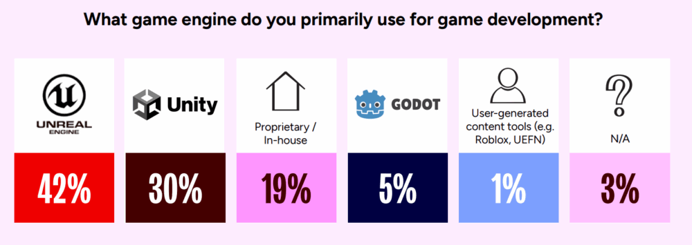 直近2回の調査(2024年と2025年)ではUnreal EngineとUnityの使用率が拮抗していたのに対して、今回は明確に前者の優位性が判明しました。