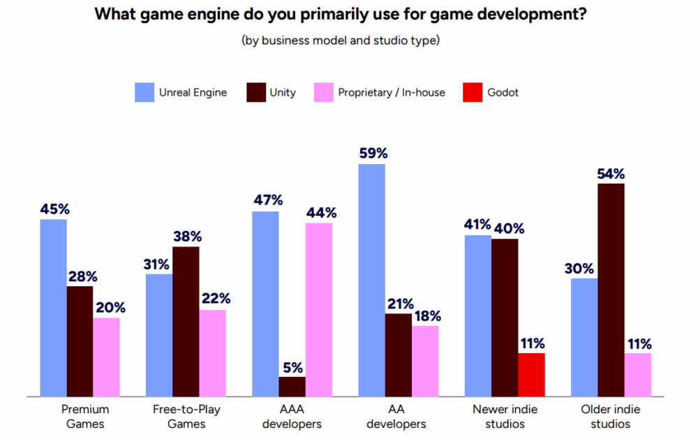 ゲームエンジンの使用状況を、ゲームスタジオ規模やゲームのマネタイズモデルごとにまとめると、以下のグラフのようになります。UnrealはAAおよびAAAゲーム開発スタジオで好まれる一方で、Unityは老舗インディーズスタジオや無料ゲーム開発で使われる傾向があります。また、新興インディーズスタジオの一部では、新興ゲームエンジンGodotが使われているのが注目に値します。