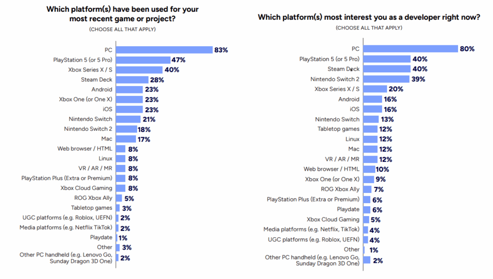以上の質問は、「開発者として現在最も関心のあるプラットフォームは何ですか(複数回答可)」という質問の回答と合わせて見た場合、興味深いことがわかります。この質問でもPCとPlayStation 5(あるいは5 Pro)が上位なのに対して、3位がSteam Deak、4位Nintendo Switch 2に浮上するのです(以下の右側グラフ)。