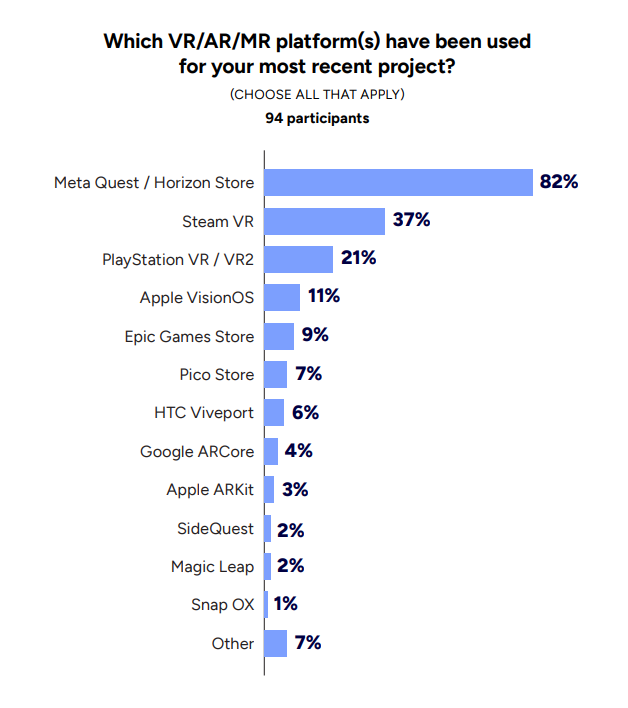 VR/AR/MRプロジェクトに関しても、プラットフォーム調査を行いました。調査対象を直近1年以内に当該プロジェクトに関わった回答者に絞ったところ、該当者は94名と少数でした(回答者全体の約8%)。