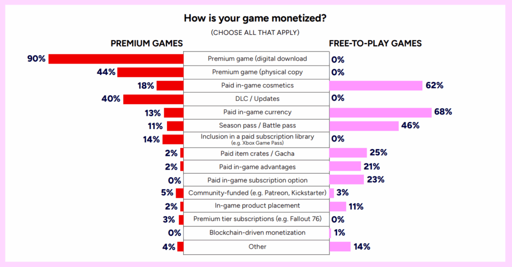 有料ゲームのマネタイズは、1位はゲーム本体のダウンロード料金の90%であり、2位は物理媒体のゲーム本体料金、3位はダウンロードコンテンツやアップデートとなりました。対して基本無料ゲームは、1位はゲーム内通貨の68%であり、2位はスキンなどのゲーム内課金アイテム、3位はシーズンパスやバトルパスでした。