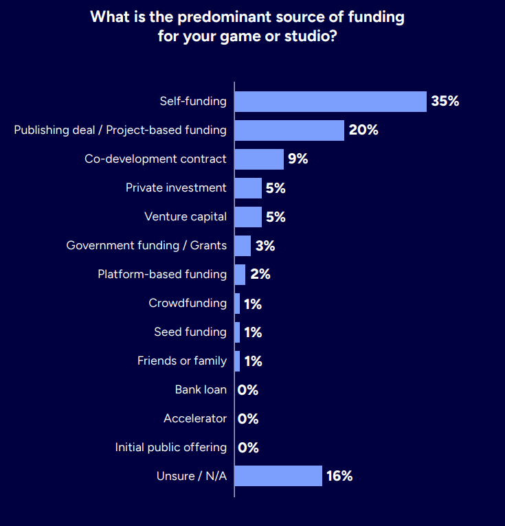 ゲームスタジオ所属のゲーム開発者と個人開発者に対して、ゲーム開発の資金調達方法に尋ねたところ、1位は自己資金の35%、2位は配信契約/プロジェクトごとの資金調達の20%、3位が共同開発契約でした。