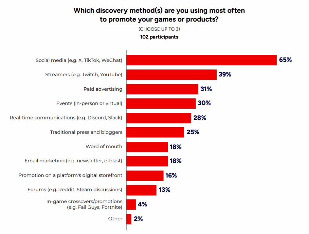 ゲームマーケター100名に対しては、ゲームのプロモーション手段について質問しました。その結果、1位がXやTikTokなどのソーシャルメディアの65%、2位がTwitchやYouTubeでゲーム実況などを行うストリーマーの39%であり、これらの手段がやや突出していました。
