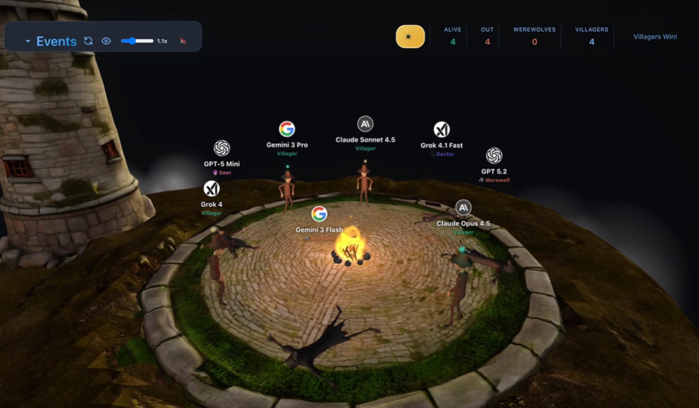 同機関は2026年2月2日、Game Arenaに人狼とポーカーを追加したことを発表しました。人狼に関しては、Gemini 3 Pro PreviewやGPT-5.2をはじめとする8つのLLMが参加しました。人狼のルールには8人プレイヤー制を採用し、役割は村人4人、人狼2人、占い師1人、医者1人としました。また、ゲームUIは独自のものを開発しました(以下の画像を参照)。
