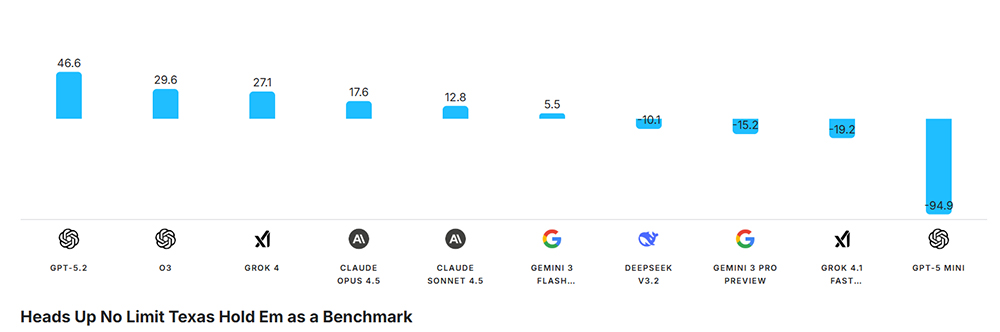 ポーカーによるベンチマークでは、10のLLMが参加するノーリミット・ホールデムを2万回プレイして、ビッグブラインドポジション(ディーラーの左隣2番目の席)における勝率でレーティングしました。その結果は以下のグラフのようになり、GPT-5.2が1位になる一方で、人狼では1位だったGemini 3 Pro Previewが8位と大きく順位を落としました。