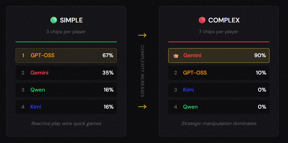 So Long Suckerによるベンチマークから得られた知見は、主に2つあります。1つめは、ゲームの複雑性を変えると、LLMの序列が変わることです。より複雑な初期保有チップ数7枚のゲームで1位となったGemini 3 Flashは、長期的推論に優れていると言えます。