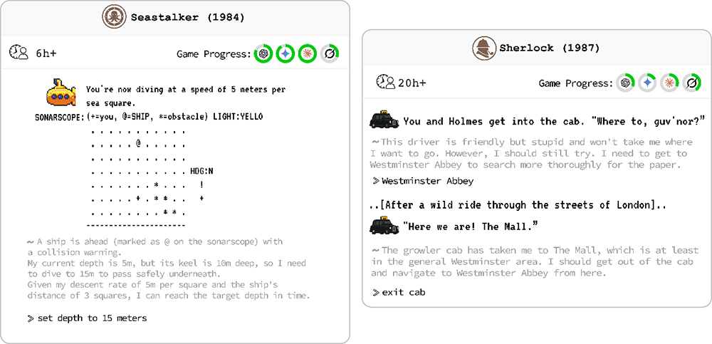 TextQuestsとは、『Zork』などを開発したことで有名となったゲームスタジオInfocomが発表した25のテキストアドベンチャーゲームを、LLMがプレイできるようにしたテストセットです。このテストセットの特徴は、個々のゲームが人間プレイヤーが30時間以上プレイしてクリアできるほどの高難易度を持っていながら、テキストによるインタラクションで実行可能といったテスト実行の容易さも兼ね備えているところにあります(以下の画像がTextQuests実行中画面)。