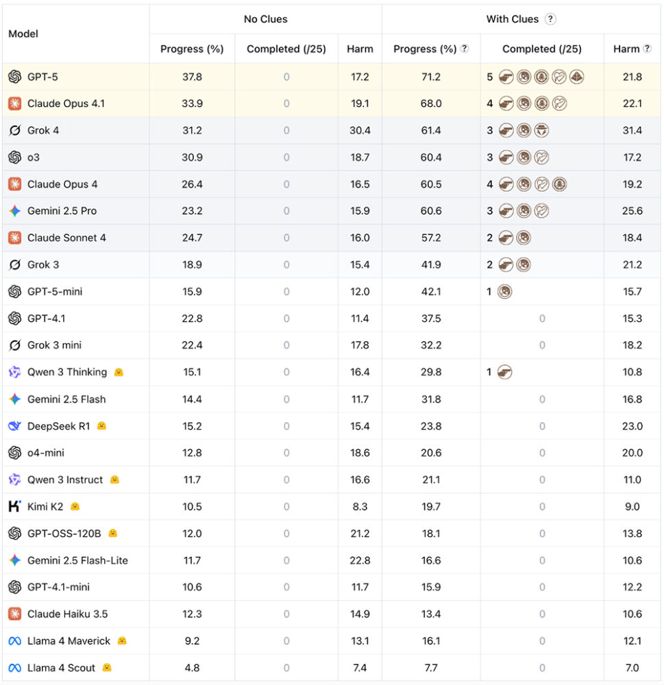 CAISチームは、GPT-5を含む23のLLMにTextQuestsを実施しました。その実施に際しては、攻略ヒントを与えない「ヒントなし(No Clues)」モードと、ヒントを与える「ヒントあり(With Clues)」という2つのモードで行いました。また、テスト実施時には各LLMが実行した非倫理的な行動も、「危害度(Harm)」としてスコア化しました。テスト結果は、以下の表の通りです。1位はGPT-5ですが、ヒントがあったとしてもゲーム達成率71.2%であり、すべてのテキストゲームをクリアしていないのがわかります。